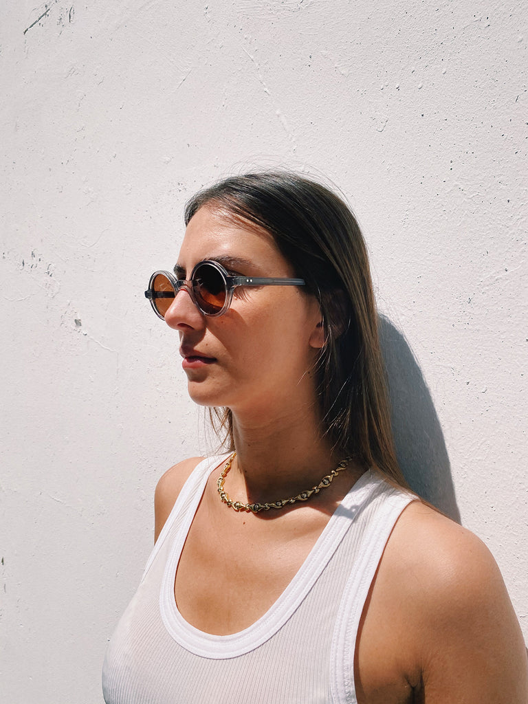 מסגרת אצטט עגולה בצבע אפור שקוף עם עדשות פולוראיד חומות אשר עוצבה בהשראת האייקון הנצחי ג׳ון לנון, מתאימה לבעלי פנים צרות עד בינוניות או לחובבי אופנת הסמול סייז