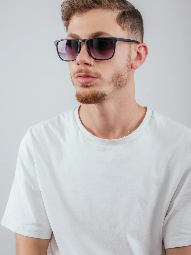 מסגרת אינג׳קשן מלבנית בצבע שחור מט עם עדשות אפורות מדורגות, מתאימה לבעלי פנים בינוניות עד רחבות