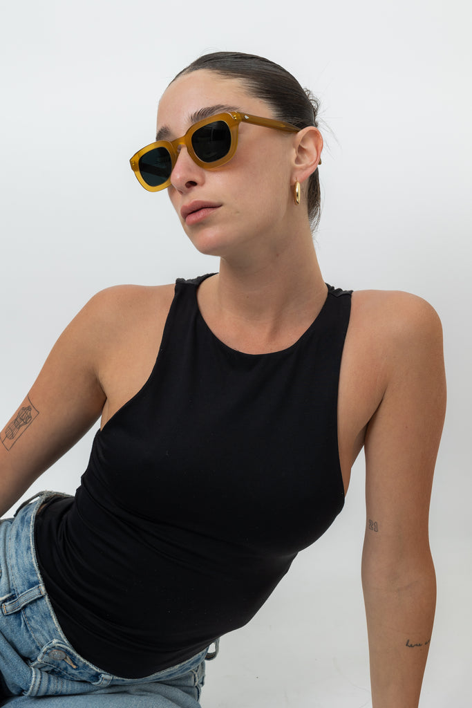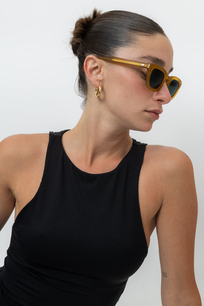 מסגרת ביו אצטט איטלקית צהובה רטרו עם עדשות פולוראיד ירוקות, הדגם עוצב בהשראת אופנת משקפי השמש של מילאנו בתחילתן של שנות ה 80 והוא מתאים לכל סוגי מבני הפנים מלבד צרות מאוד ורחבות מאוד