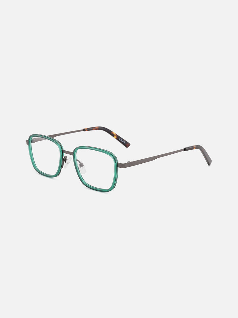 מסגרת מתכת קלת משקל מלבנית בצבע ירוק וכסוף, עוצבה בהשראת אופנת האולד סקול האמריקאית ומתאימה לכל סוגי הפנים מלבד רחבות מאוד.