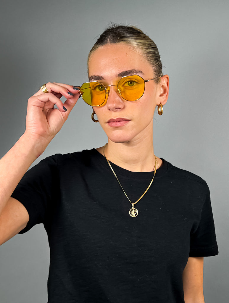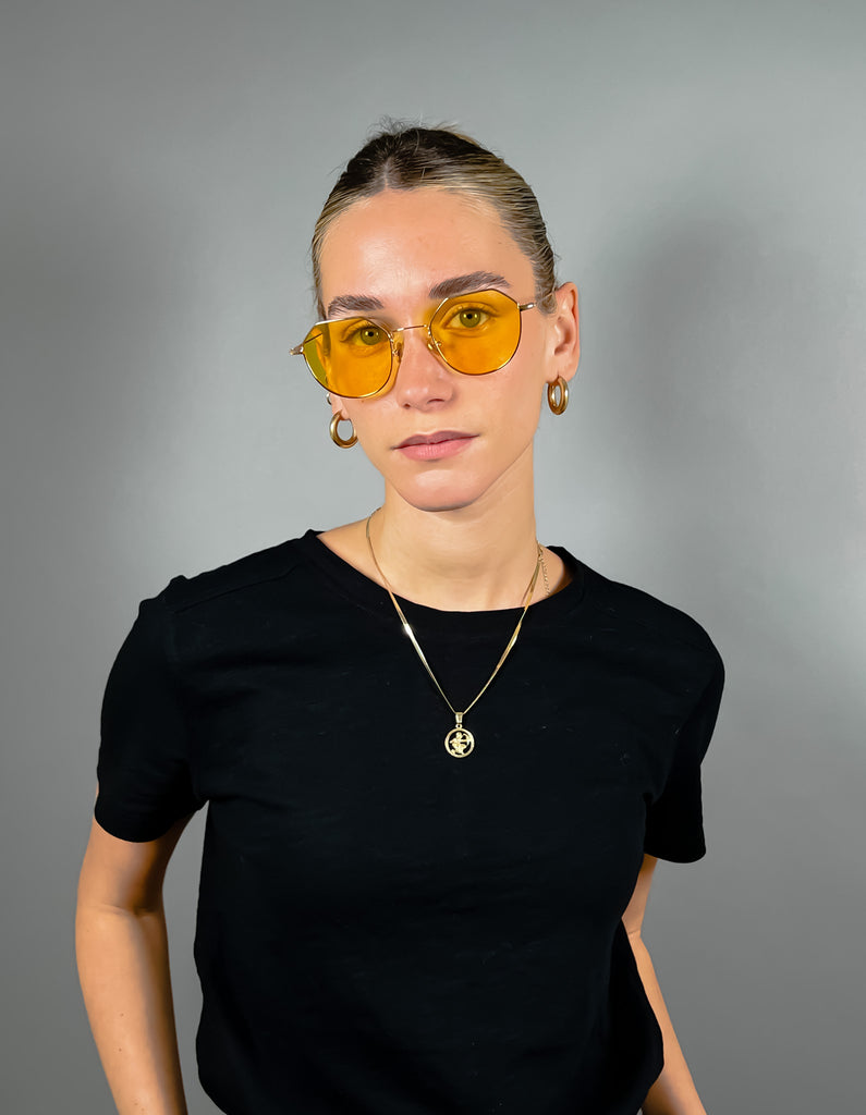 מסגרת מתכת מוזהבת עם עדשות צהובות
