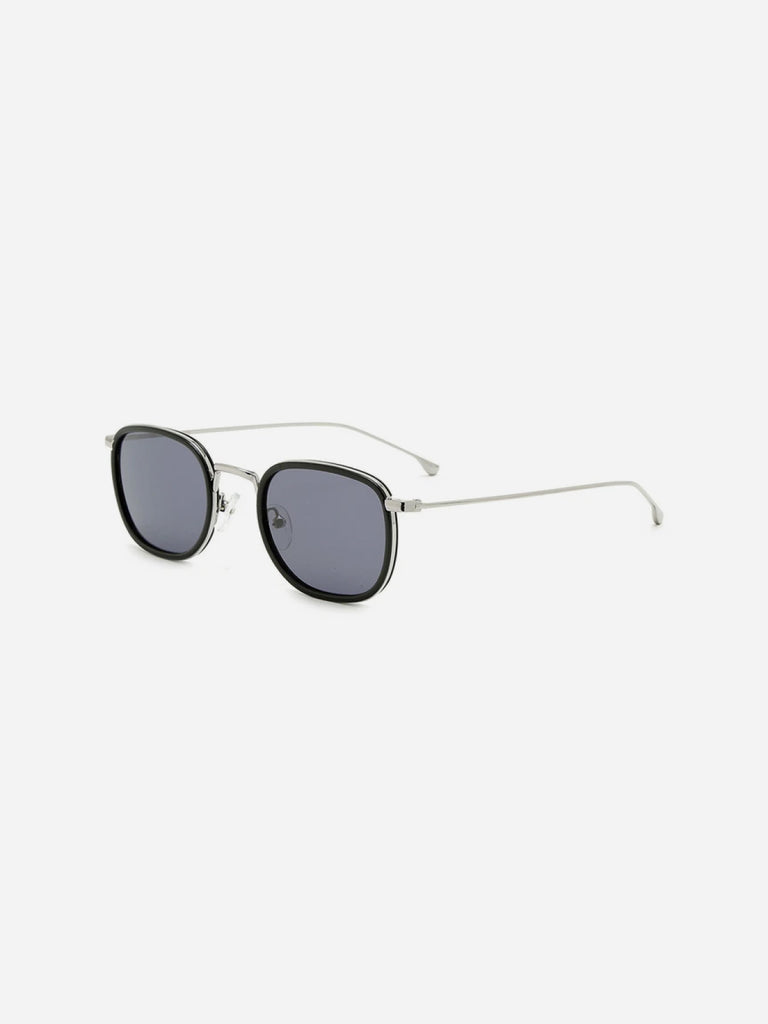 מסגרת מתכת מלבנית כסופה עם מעטפת אצטט בצבע שחור ועדשות אפורות, מתאימה לבעלי פנים צרות עד בינוניות,